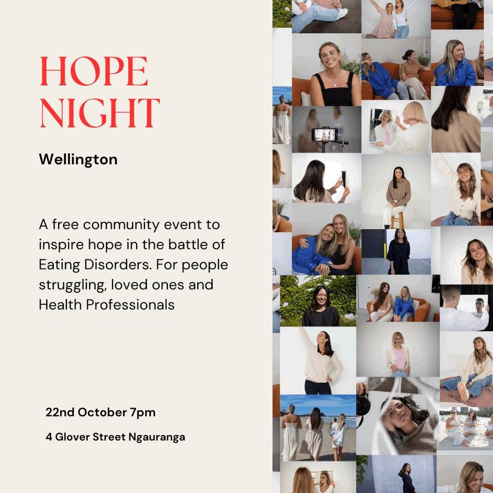 Hope Night is a free community event for those struggling with eating disorders/body image. This event is suitable for family, friends and professionals.